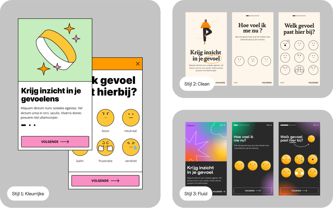 Op basis van trends en doelgroeponderzoek creëerden we drie brand identity stijlen. Omdat we alles in dit traject kunnen onderbouwen, wilden we ook deze stijlen testen. Van één stijl waren we overtuigd: deze komt als beste uit de test. Eén met opvallende gradients en speelse vormen. A case of ‘kill your darlings’, want verrassing: jongeren kozen helemaal niet voor deze stijl! Maar met hun reacties op zak, konden we de Feelee-stijl wel onderbouwd opbouwen.