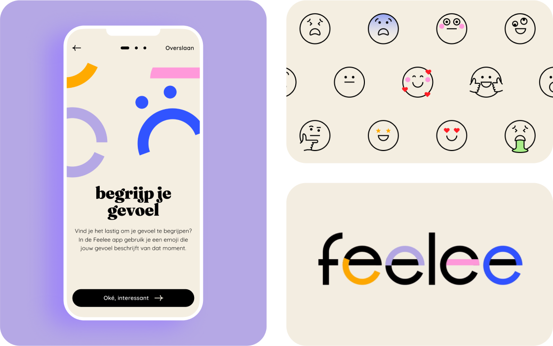 Bij jezelf inchecken om stil te staan bij je gevoelens doe je liever niet eens per week, maar steeds opnieuw. Met de oneindige cirkel als vertrekpunt en emoji’s als terugkerend element, hebben ronde vormen nu een prominente rol in de Feelee-huisstijl. In het bewegende logo en in de huisstijlelementen komen vier basisemoji’s terug: blijdschap, verdriet, verbazing en onverschillig.