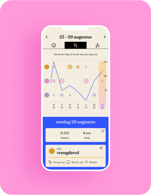 In een overzicht leren jongeren hoe zij hun mentale gezondheid nu al beïnvloeden: welk effect had hun gedrag van afgelopen week op hun gevoelens? Hiervoor geven ze tijdens het incheckmoment aan wat ze doen en halen we passieve data op: het aantal gezette stappen en slaapuren. Deze inzichten geven jongeren iets om over te beginnen in gesprek met een naaste, leerkracht, werkgever of hulpverlener.
