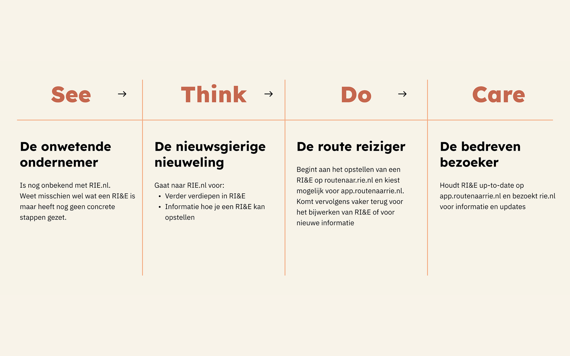 Het Ministerie van Sociale Zaken en Werkgelegenheid en TNO zijn onderdeel van Steunpunt RI&E: een team van medewerkers en werkgevers dat zich inzet voor veilige en gezonde werkomgevingen. Na de brief aan de Tweede Kamer deed innovatiebureau Snijboon onderzoek naar werkgevers en de RI&E. Een mooie start, want zo gingen we samen met Snijboon, Hike Digital en Steunpunt RI&E goed geïnformeerd op zoek naar een oplossing. De doelgroep: werkgevers met maximaal 25 medewerkers.
