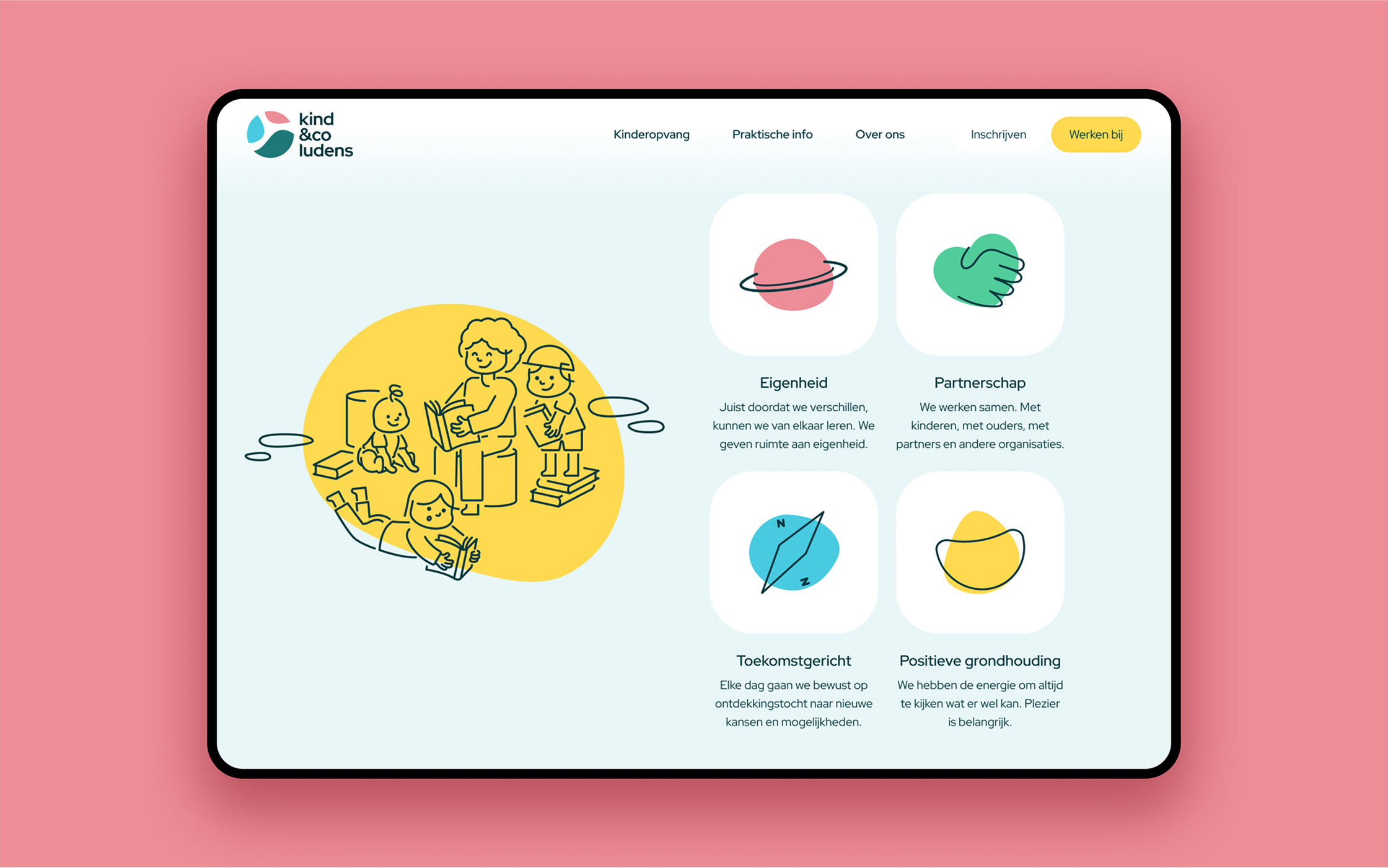 Kind&co ludens is de grootste, maatschappelijkekinderopvang van Nederland. Dag in dag uit zettenmedewerkers zich in voor gelijke ontwikkelkansen voorieder kind. Zo geven ze kleur aan de toekomst. Om deverschillende doelgroepen beter te verbinden, wildeKind&co ludens een nieuw en gebruiksvriendelijkplatform ontwikkelen.